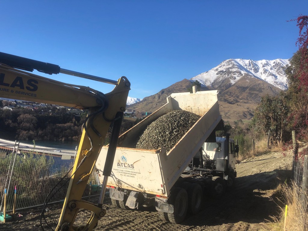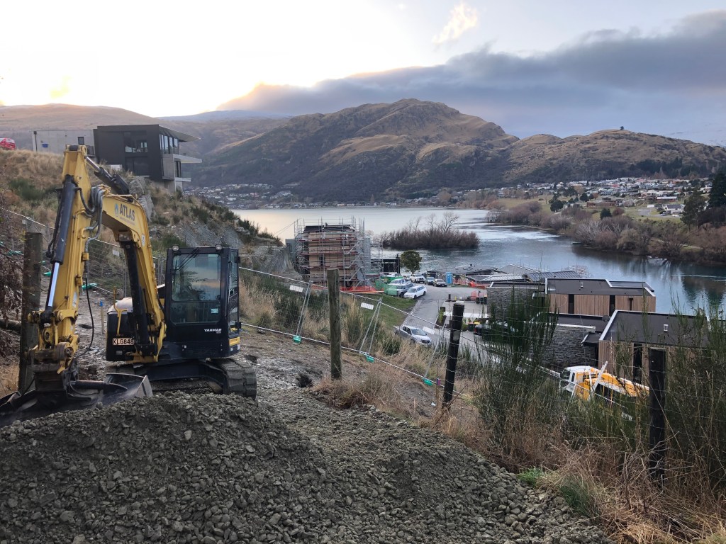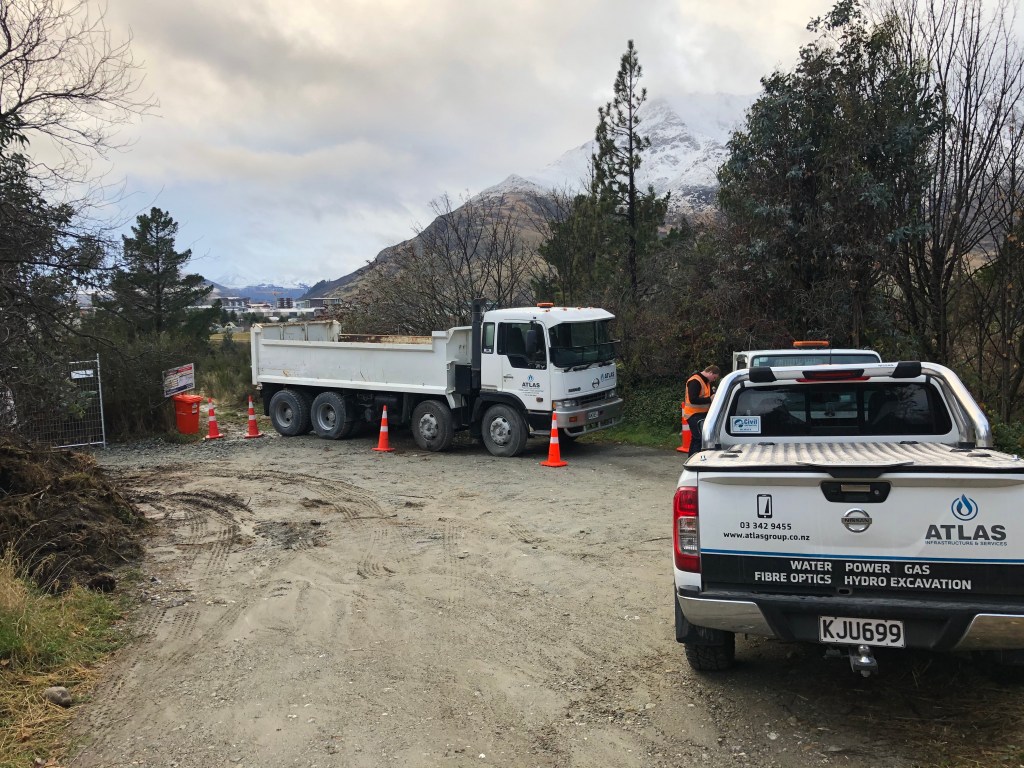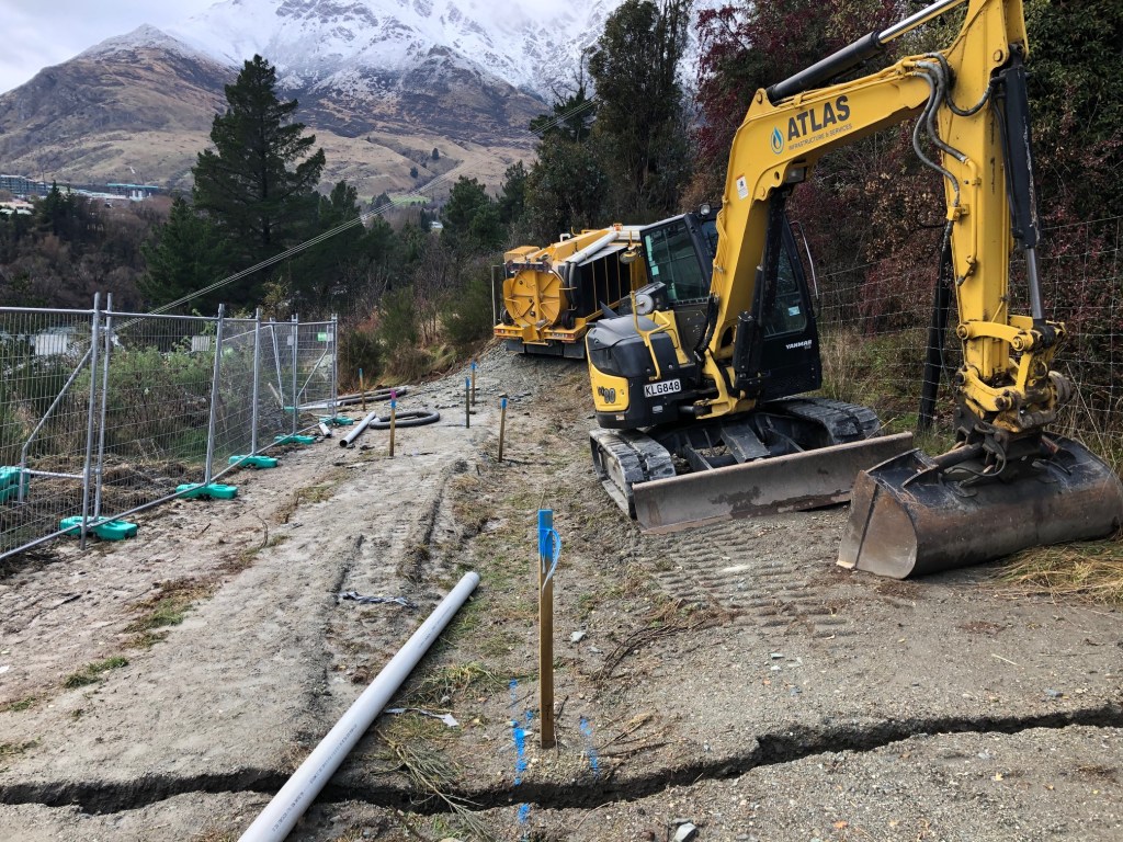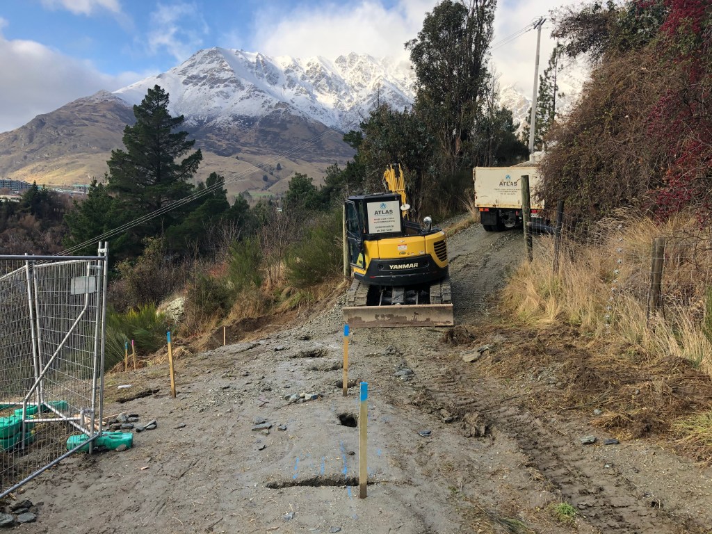This was a high profile site coming out of Queenstown towards Kelvin Heights and involved hill side works and Rock Drilling. The main aim of the project is to install a new power cable in an approved easement. This easement rose up a steep hill and required anchoring and slinging of excavators on the steep slope and drilling 200mm holes in the rock face before turning a bend and running along the top of a ridge. The works required great care as Frankton’s main high pressure Water Mains ran through this easement thus requiring a week of Hydro Excavation and survey/setting out work before we could place an excavator in the area. The project has run smoothly after months of planning and customer liasion.